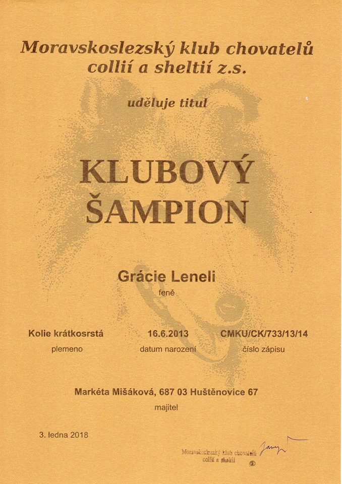 KLUBOVÝ ŠAMPION GRACIE LENELI